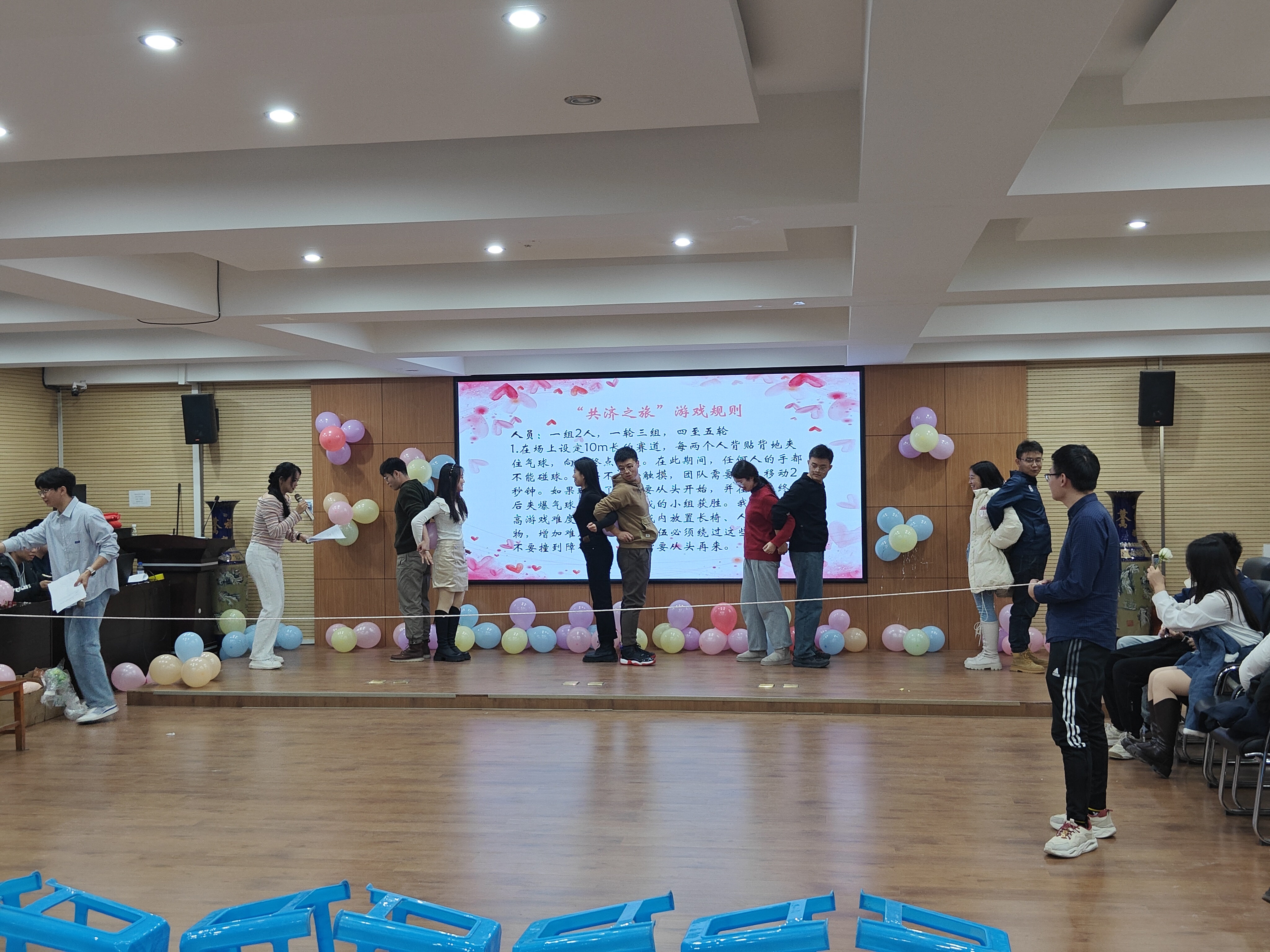 第三个游戏是“共济之旅”,由两位同学夹住气球,在不用手触碰气球的前提下,跨过层层障碍,并在到达终点后夹爆气球,各组选手你追我赶互不相让,虽然在行进过程中有气球掉落,但在观众的鼓励声中选手们迅速调整状态,完成了比赛,展现出年轻人的青春活力。