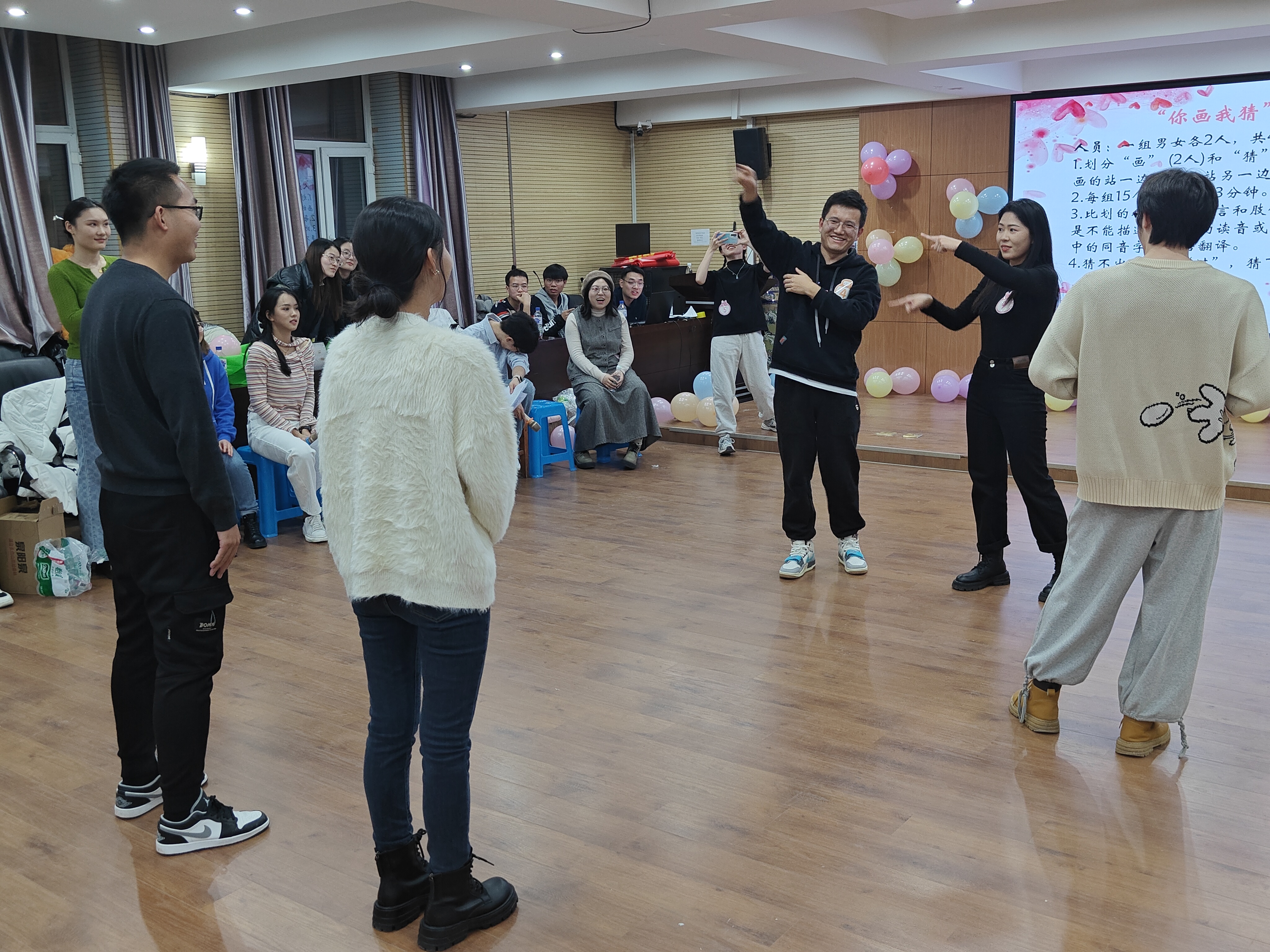第二个游戏是“你画我猜”,每组由四位同学组成,两人比划两人猜词语,在有限的时间内猜出词语更多的组获胜,同学们的动作和描述时常引起场边观众的鼓掌和大笑,他们之间的精妙配合也不时引起大家的阵阵感叹,现场气氛激烈而又欢乐。