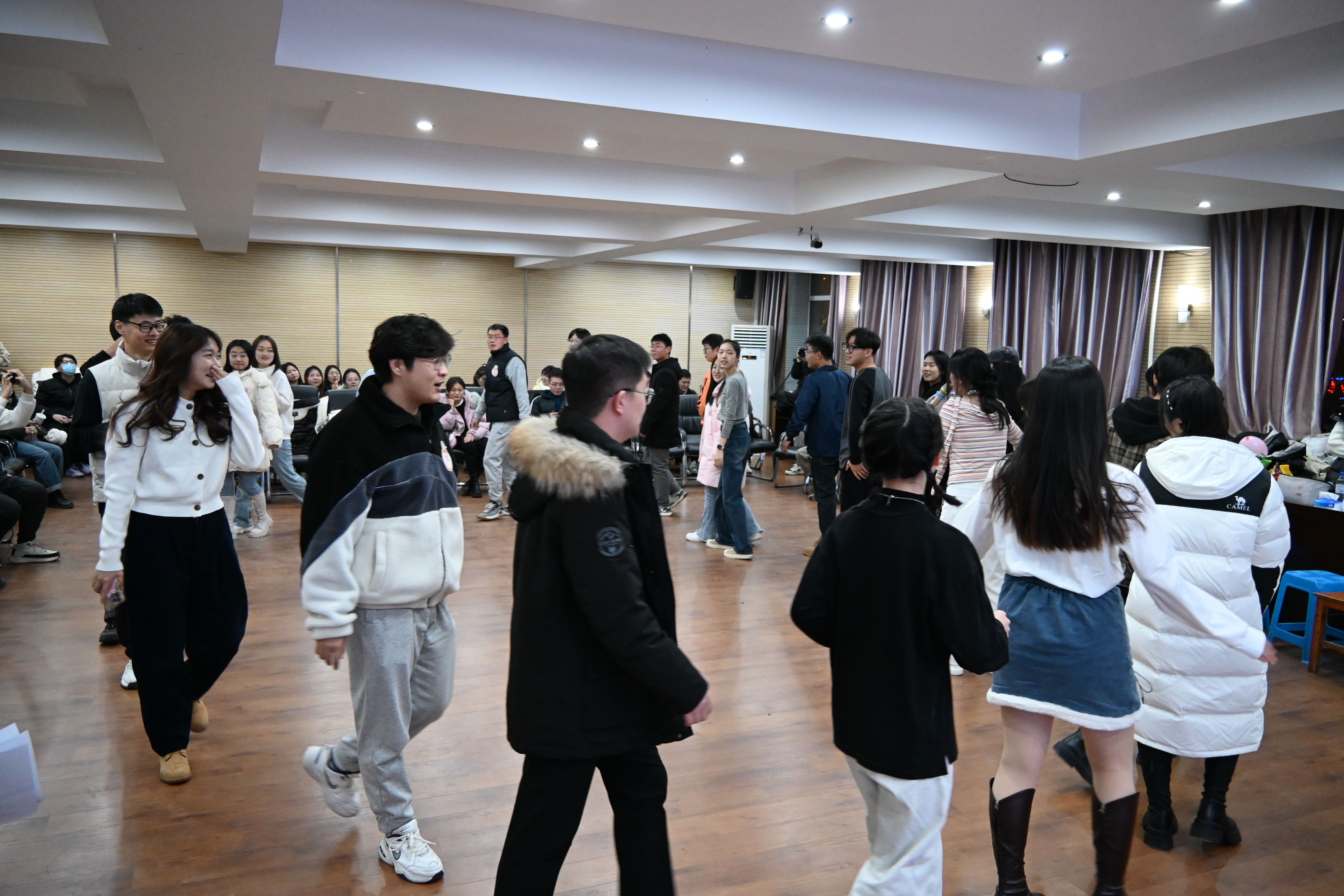 接下来是游戏破冰环节。第一个游戏是“喊数抱团”,参加游戏的同学会随着音乐绕圈跑,随后根据主持人喊出的数字抱在一起。在欢声笑语中大家之间的距离被逐渐拉近,游戏结束的自我介绍环节也让大家对彼此更加熟悉。