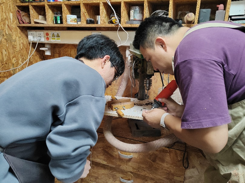 以吊坠为例,先准备好原料,确定好形状后开始打磨,需要经过细磨、水磨、开孔、抛光、系绳等多道工序后才能成型。同学们通过四个小时的亲手操作,对木工艺术有了更多的了解和认识。艺术点缀生活,制作成功的成就感是无法用言语形容的。制作结束后,同学们互相拍照留念。