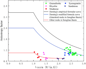 研究进一步测量得到不同种类岩石样品的导热系数分布范围及各向异性因子,归纳总结了不同种类岩石的导热各向异性特征。同时提出了松辽盆地不同种类岩石导热系数各向异性因子的修正方程。