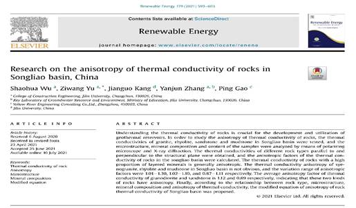 20217月,yl23455永利集团于子望副教授团队,在国际著名学术刊物《Renewable Energy》上发表题目为“Research on the anisotropy of thermal conductivity of rocks in Songliao basin, China”的论文,针对松辽盆地岩导热系数各向异性特征进行了研究,对于研究区地热能开发具有重要意义。