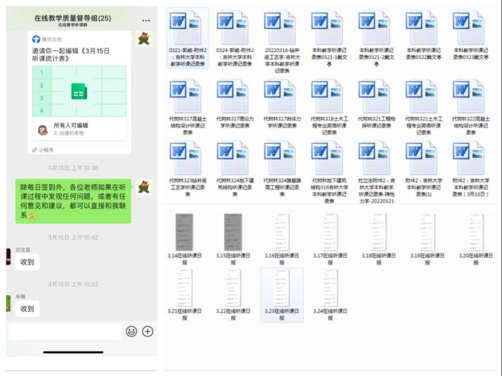 启动在线教学以来,学院成立了由领导班子成员、党委委员、教学委员会成员、系主任和教学管理人员组成的教学质量督导组,全面加强线上教学质量监控,确保实现“保开课、保稳定、保质量”的工作目标。截至3月25日,学院在线教学质量督导小组共25人已听课236门次,完成听课记录200余份。在督导过程中,协调反馈师生在线教学中的问题和困惑,帮助教师完善在线教学的方式方法,以督导促帮助、以督导促服务、以督导促提升。
