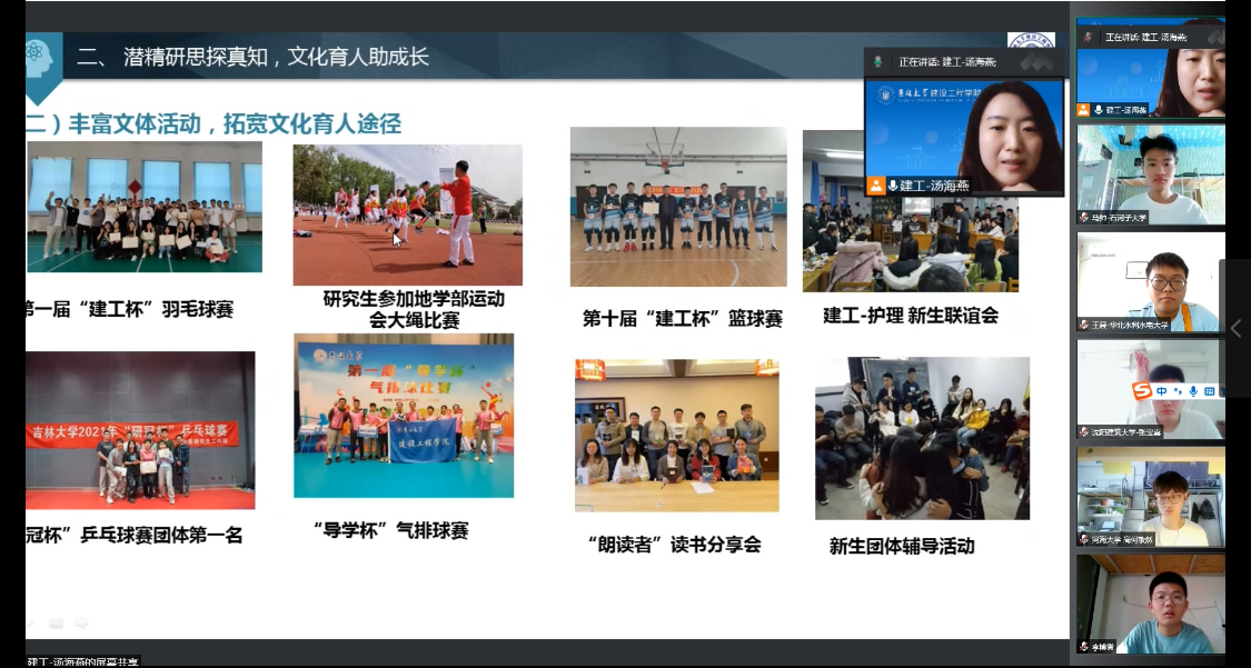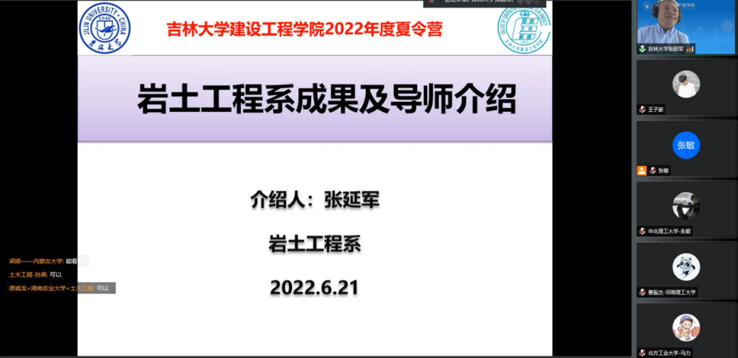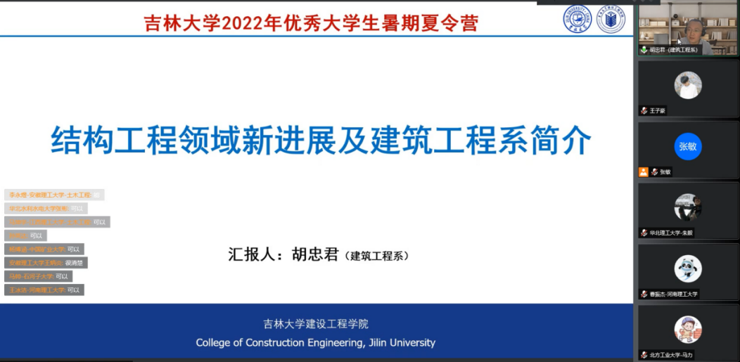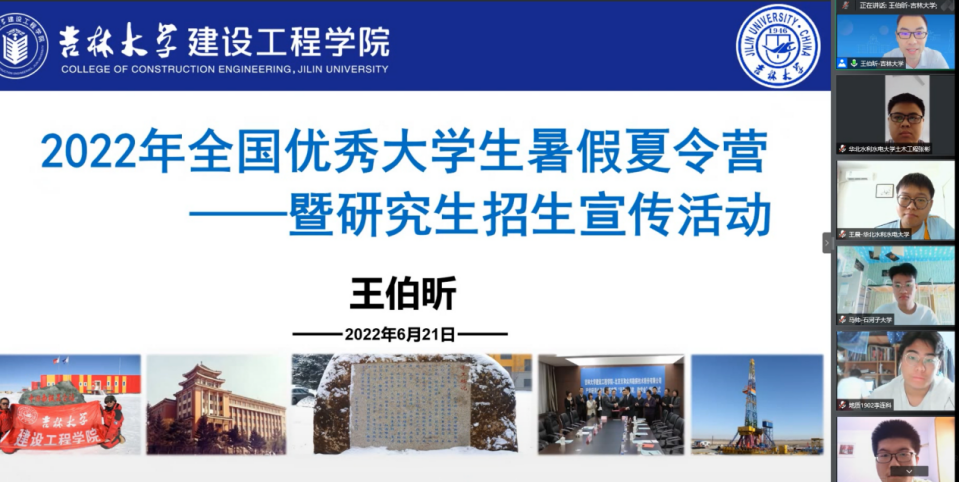 6月21日上午9:00开幕式仪式正式启动,yl23455永利集团副院长王伯昕教授在线为营员们介绍学院基本情况。王院长首先对各位营员的到来表示热烈的欢迎,接着介绍了吉林大学和yl23455永利集团的整体情况,从yl23455永利集团学科建设与发展前景、师资构成与人才引育、本科生与研究生教育、科学研究与主要成果、国际交流与联合办学、研究生学习与学风等六个方面向营员们展示了学院的学科优势特色。