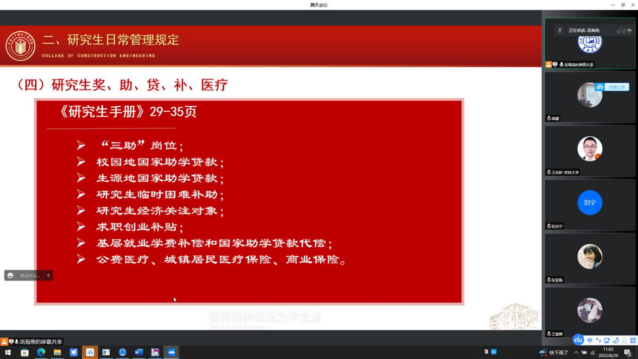 使研究生尽快熟悉校园环境、了解校规校纪等相关管理规定、培养各环节及其要求,学院先后于829日、830日开展了新生入学教育系列讲座,切实上好研究生入学的第一课,为研究生成长成才奠定基础。为响应学校疫情防控工作相关要求,系列讲座于线上开展。