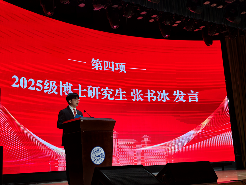 2025级博士研究生张书冰作为高年级学生代表发言,分享了以开放心态拥抱改变、用真挚情感滋养理想、怀着感恩之心前行的求学感悟,鼓励新同学们怀揣初心、坚守热爱,在学术探索与人生成长中绽放理想光芒。
