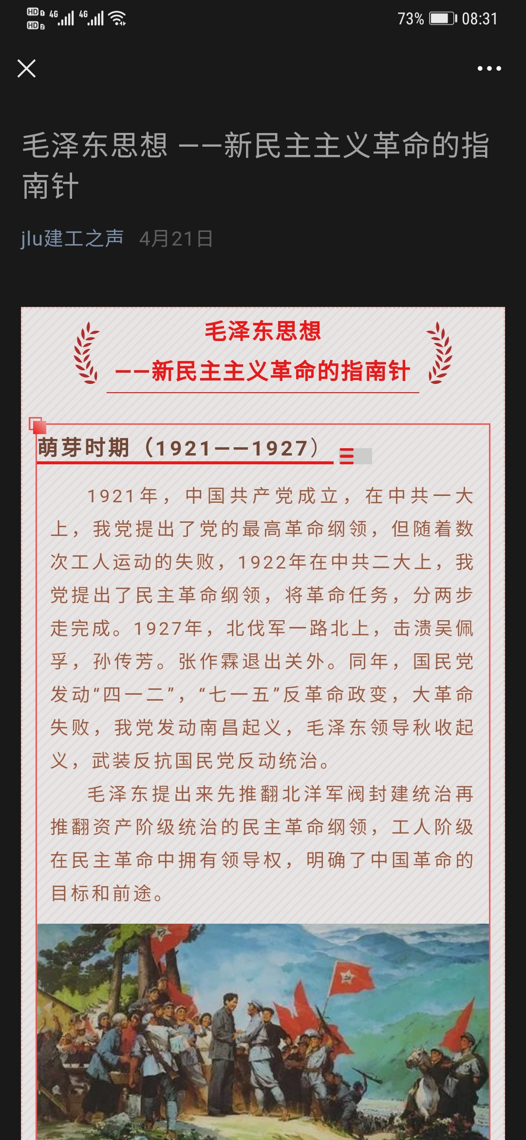 学院党委利用学院水工楼大厅电子屏幕,定期投送党史专题教育幻灯片,目前已经投送七个专题的学习内容;充分利用新媒体平台,在学院微信群中开展“党史百年天天读”活动,每天为教职工推送“党史上的今天”相关内容;利用学院“建工之声”微信公众平台,开展“毛泽东思想-新民主主义革命的指南针”线上学习活动,以及“开天辟地-中国共产党第一次全国代表大会”线上学习活动。