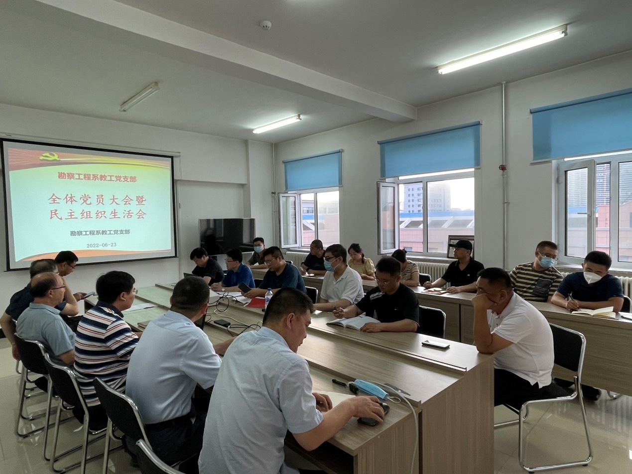 2022年6月23日,yl23455永利集团勘察工程系教工党支部在朝阳校区钻采实验楼528会议室召开全体党员大会暨主题党日和民主组织生活会。会议共分为三个主要内容,即党员干部讲党课——学习习近平总书记重要讲话精神、主题党日——讲述身边抗疫故事、民主组织生活会——评议党支部、党员自评。