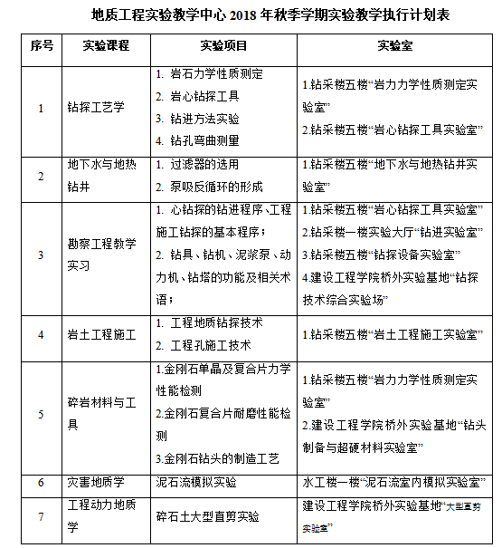 地质工程实验教学中心2018年秋季学期实验教学执行计划表